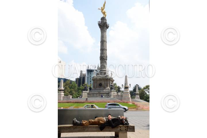 MÉXICO, D.F., 20SEPTIEMBRE2015.- Un indigente duerme bajo la sombra en una de las bancas instalada sobre paseo de la Reforma frente al Ángel de la Independecia. FOTO: GALO CAÑAS /CUARTOSCURO.COM