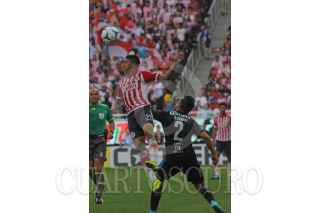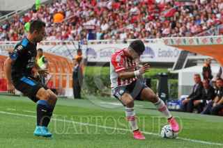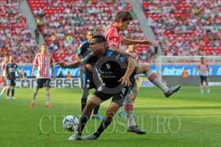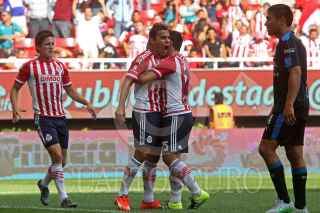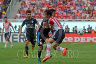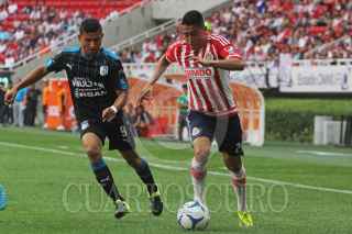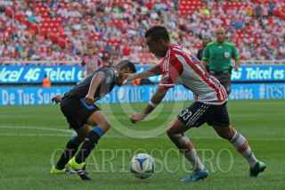 ZAPOPAN, JALISCO. 20SEPTIEMBRE2015.- El jugador del Chivas Carlos Fierro, disputa un balón frente al contrario del Querétaro, Dionisio Escalante, esto en partido correspondiente a la Jornada 9 del Torneo Apertura 2015 de la Liga MX, en donde se enfrentan los equipos de las Chivas de Guadalajara frente a los Gallos Blancos de Querétaro, en partido que se lleva a cabo en el Estadio Omnilife, el mardaor final fue de 2-1 a favor del equipo local. FOTO: FERNANDO CARRANZA GARCIA/ CUARTOSCURO.COM