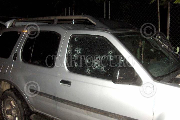 CHILPANCINGO, GUERRERO 02JUNIO2006.- Aspecto del atentado que sufrio el encargado de la Unidad Mixta de Atencion al Narcomenudeo (UMAN) en la ciudad de Chilpancingo Orlando Martinez Morales la noche de este viernes cuando llegaba a dichas instalaciones ubicadas en la primera calle de la colonia del PRI, recibiendo mas de 50 impactos de bala calibre 45 y de AK-47 (cuerno de chivo) la camioneta en la que viajaba, resultando herido de gravedad, muriendo su acompañante el policia del estado adscrito a dicha dependencia Almicas Antonio. En la grafica el cuerpo del elemento de la policia del estado adscrito a la UMAN Almicas Antonio quien fallecio en el atentado al recibir varios impactos de bala. FOTO: Oscar Alvarado/CUARTOSCURO.COM