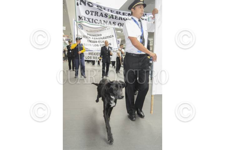 MÉXICO, D.F., 22SEPTIEMBRE2015.- Integrantes del Frente por la Defensa de la Aviación Nacional conformados por la Asociación Sindical de Pilotos Aviadores de México (ASPA), Sindicato de Sobrecargos de Aviación (ASSA) y el Sindicato de Trabajadores de Tierra, marcharon de la Terminal 2 a la Terminal 1 del Aeropuerto Internacional de la Ciudad de México en rechazo al convenio en materia de aviación entre México y Estados Unidos. FOTO: SAÚL LÓPEZ /CUARTOSCURO.COM
