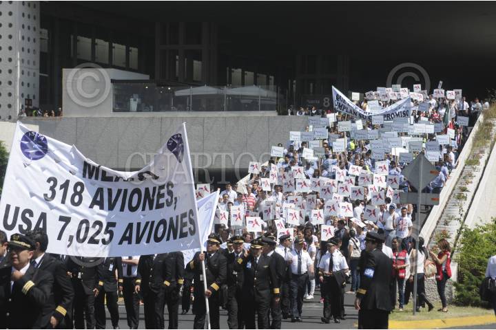 MÉXICO, D.F., 22SEPTIEMBRE2015.- Integrantes del Frente por la Defensa de la Aviación Nacional conformados por la Asociación Sindical de Pilotos Aviadores de México (ASPA), Sindicato de Sobrecargos de Aviación (ASSA) y el Sindicato de Trabajadores de Tierra, marcharon de la Terminal 2 a la Terminal 1 del Aeropuerto Internacional de la Ciudad de México en rechazo al convenio en materia de aviación entre México y Estados Unidos. FOTO: SAÚL LÓPEZ /CUARTOSCURO.COM