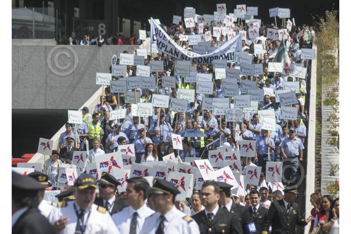 MÉXICO, D.F., 22SEPTIEMBRE2015.- Integrantes del Frente por la Defensa de la Aviación Nacional conformados por la Asociación Sindical de Pilotos Aviadores de México (ASPA), Sindicato de Sobrecargos de Aviación (ASSA) y el Sindicato de Trabajadores de Tierra, marcharon de la Terminal 2 a la Terminal 1 del Aeropuerto Internacional de la Ciudad de México en rechazo al convenio en materia de aviación entre México y Estados Unidos. FOTO: SAÚL LÓPEZ /CUARTOSCURO.COM