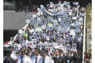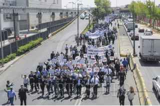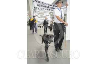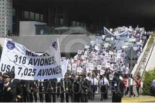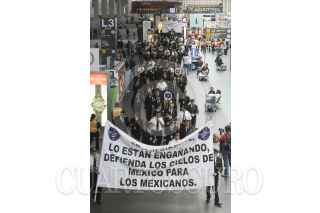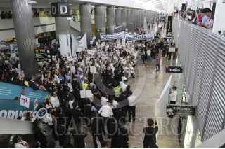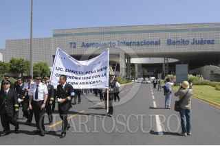 MÉXICO, D.F., 22SEPTIEMBRE2015.- Integrantes del Frente por la Defensa de la Aviación Nacional conformados por la Asociación Sindical de Pilotos Aviadores de México (ASPA), Sindicato de Sobrecargos de Aviación (ASSA) y el Sindicato de Trabajadores de Tierra, marcharon de la Terminal 2 a la Terminal 1 del Aeropuerto Internacional de la Ciudad de México en rechazo al convenio en materia de aviación entre México y Estados Unidos. FOTO: SAÚL LÓPEZ /CUARTOSCURO.COM