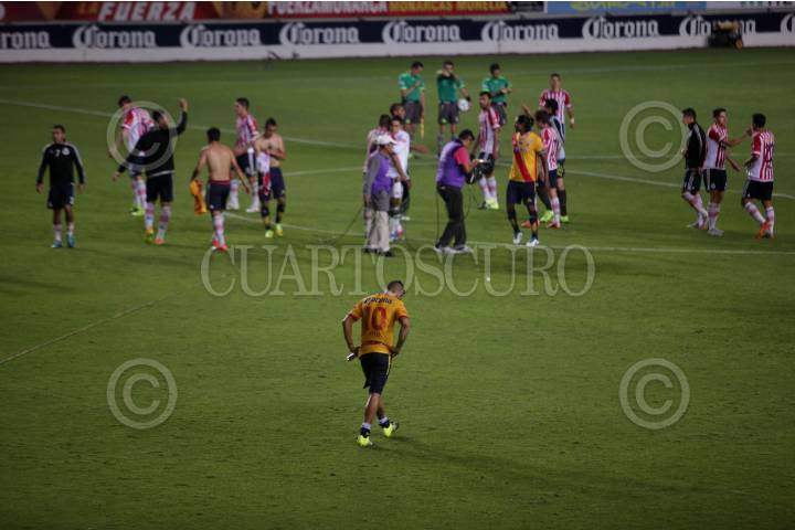 MORELIA, MICHOACÁN, 23SEPTIEMBRE2015.- Monarcas perdió contra Chivas en partido de Cuartos de Final de la Copa MX por 1-2 en el Estadio Morelos, con esto termina la participación de el equipo rojiamarillo en este torneo. En la imagen el único gol anotado por Joel Huiqui FOTO: ALAN ORTEGA / CUARTOSCURO.COM