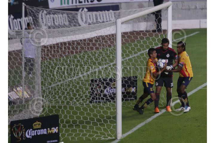 MORELIA, MICHOACÁN, 23SEPTIEMBRE2015.- Monarcas perdió contra Chivas en partido de Cuartos de Final de la Copa MX por 1-2 en el Estadio Morelos, con esto termina la participación de el equipo rojiamarillo en este torneo. En la imagen el único gol anotado por Joel Huiqui FOTO: ALAN ORTEGA / CUARTOSCURO.COM