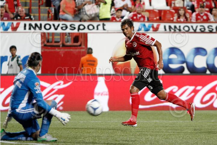 TIJUANA, BAJA CALIFORNIA, 26SEPTIEMBRE2015.- Silvio Romero festeja el gol del empate durante el partido del día de ayer entre Xoloitzcuintles de Tijuana y Jaguares de Chiapas realizado en el Estadio Caliente, correspondiente a la décima jornada de la Liga Mx. El marcador final fue un empate de un gol. FOTO: CHRISTIAN SERNA /CUARTOSCURO.COM