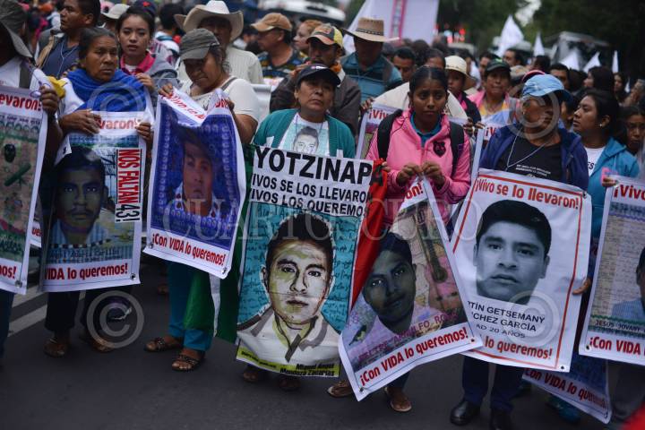 MÉXICO, D.F., 26SEPTIEMBRE2015.- Familiares de los 43 normalistas desaparecidos y 3 asesinados, acompañados de organizaciones sociales, políticas, estudiantiles y campesinas, marchan de las inmediaciones de los Pinos al Zócalo capitalino en demanda de la aparición con vida de los jóvenes y justicia para los caídos, al cumplirse un año del violento ataque el 26 de septiembre en Iguala, Guerrero. FOTO: ADOLFO VLADIMIR /CUARTOSCURO.COM
