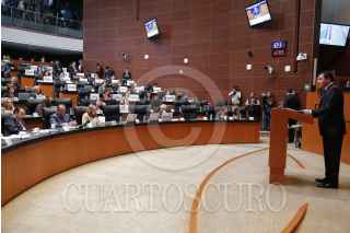 MÉXICO, D.F., 29SEPTIEMBRE2015.- Miguel Ángel Osorio Chong, secretario de Gobernación, inició su comparecencia ente senadores. Legisladores del PAN colocaron carteles que remitían a la fuga de "El Chapo", el tema de la "Casa Blanca" y el caso Ayotzinapa. FOTO: CUARTOSCURO.COM