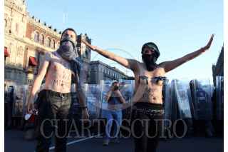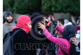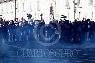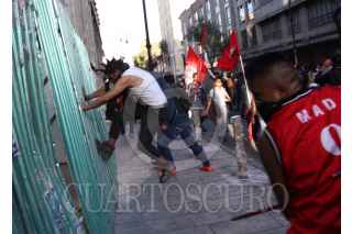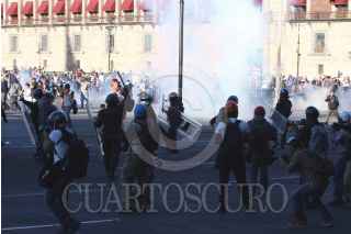 MÉXICO, D.F., 02OCTUBRE2015.- Grupos anarquistas se enfrentaron contra granaderos federales a un costado del contingente de la marcha por la conmemoración de la matanza de Tlatelolco de 1968. Granaderos utilizaron gas pimienta para replegarlos de la plancha del Zócalo. FOTO: MARÍA JOSÉ MARTÍNEZ /CUARTOSCURO.COM