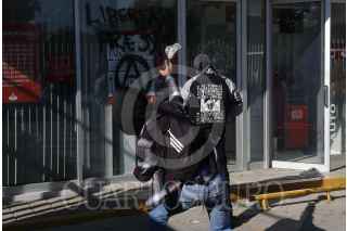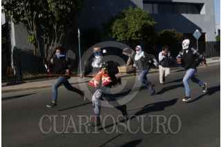 OAXACA, OAXACA, 02OCTUBRE2015.- La tarde de este viernes marcharon en la ciudad de Oaxaca un grupo de anarquistas pertenecientes al Bloque Negro quienes conmemoraron de esta forma el 47 aniversario de la matanza de estudiantes ocurrida en 1968. Los encapuchados realizaron distintos destrozos a su paso, principalmente en bancos, automotrices y una tienda de auto servicio, de esta última robaron mercancía entre bebidas alcohólicas y botanas. FOTO: ARTURO PÉREZ ALFONSO /CUARTOSCURO.COM