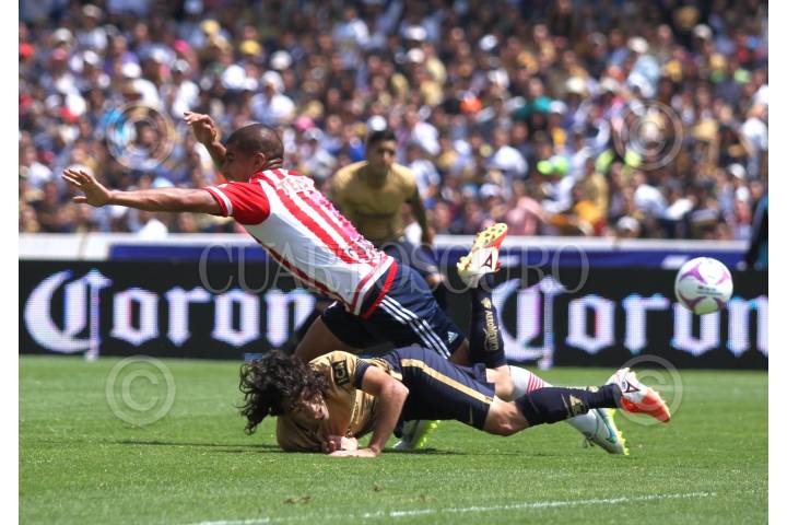 MÉXICO, D.F., 04OCTUBRE2015.- Carlos Fierro (7) y Luis Fuentes (5), disputan el balón en el juego en el que los Pumas de la UNAM ganaron a las Chivas del Guadalajara un gol por cero, en partido de la jornada 12 del Torneo de Fútbol Apertura 2015. FOTO: ADOLFO VLADIMIR /CUARTOSCURO.COM