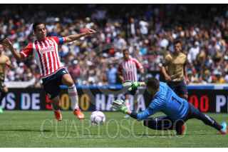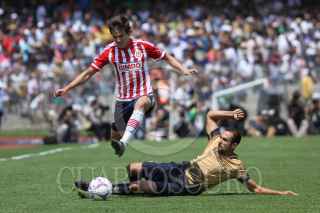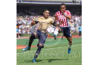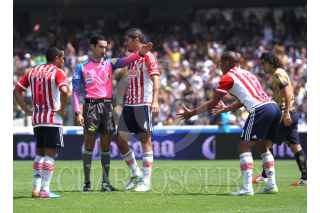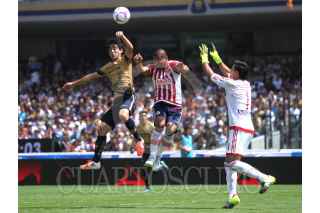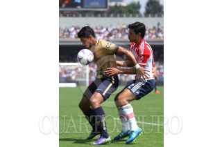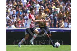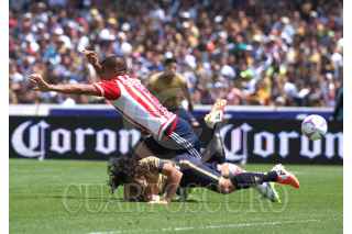 MÉXICO, D.F., 04OCTUBRE2015.- Carlos Fierro (7) y Luis Fuentes (5), disputan el balón en el juego en el que los Pumas de la UNAM ganaron a las Chivas del Guadalajara un gol por cero, en partido de la jornada 12 del Torneo de Fútbol Apertura 2015. FOTO: ADOLFO VLADIMIR /CUARTOSCURO.COM