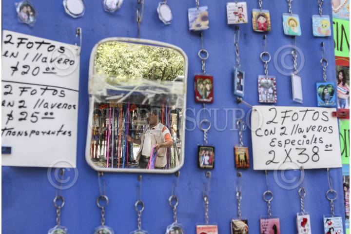 MÉXICO, D.F., 10OCTUBRE2015.- Decenas de bolsas y mochilas cuelgan en uno de los puestos de los locatarios del Bosque de Chapultepec. Abajo, una niña disfruta de un refresco para aminorar el intenso calor. FOTO: MARÍA JOSÉ MARTÍNEZ /CUARTOSCURO.COM