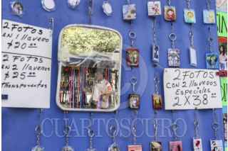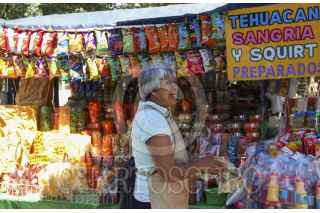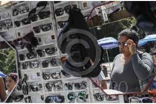 MÉXICO, D.F., 10OCTUBRE2015.- Decenas de bolsas y mochilas cuelgan en uno de los puestos de los locatarios del Bosque de Chapultepec. Abajo, una niña disfruta de un refresco para aminorar el intenso calor. FOTO: MARÍA JOSÉ MARTÍNEZ /CUARTOSCURO.COM