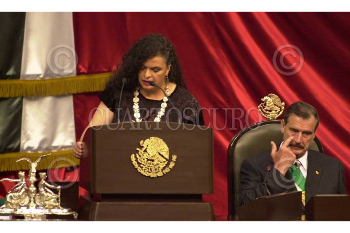 Génaro Góngora Pimentel se despide del títular del Ejecutivo, mientras que Beatriz Paredes hace lo propio con Diego Fernández de Cevallos, al término del informe de Vicente Fox . FOTO: Christian Palma/CUARTOSCURO.COM