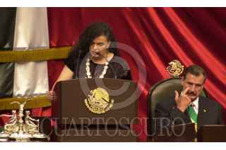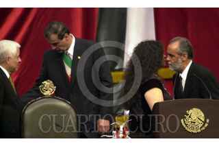Génaro Góngora Pimentel se despide del títular del Ejecutivo, mientras que Beatriz Paredes hace lo propio con Diego Fernández de Cevallos, al término del informe de Vicente Fox . FOTO: Christian Palma/CUARTOSCURO.COM