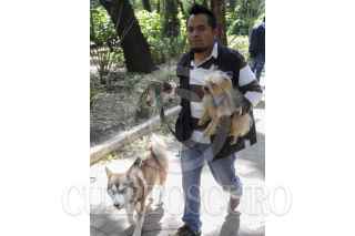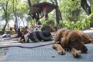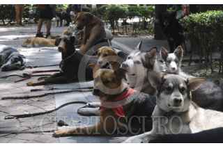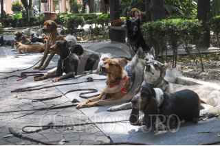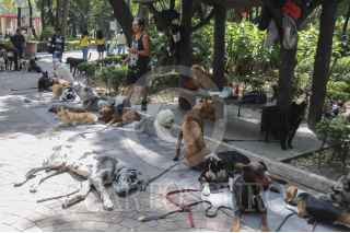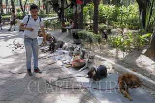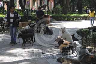 MÉXICO, D.F., 16OCTUBRE2015.- Algunos que jóvenes que se ganan la vida entrenando y paseando a perros en el parque México en la colonia Condesa mantienen a las mascotas en vigilancia y juntos en los circuitos, así mismo no permiten que ingresen a las áreas verdes ante la alerta de envenenamiento de los caninos en dicho parque. FOTO: SAÚL LÓPEZ /CUARTOSCURO.COM