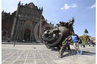 MÉXICO, D.F., 16OCTUBRE2015.- Capitalinos disfrutan tomándose fotos juntos con un par de cabezas monumentales instaladas a un costado de la Catedral Metropolitana, sobre la calle de Moneda en la colonia Centro. FOTO: ARMANDO MONROY /CUARTOSCURO.COM