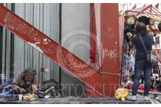 MÉXICO, D.F., 17OCTUBRE2015.- Mientras una comerciante dispone su puesto de peluches para comenzar la venta, una persona en situación de calle reúne algunos víveres que transeúntes le han dado para comenzar el día con el estómago lleno. La población callejera ha ido aumento en la ciudad, según un informe del gobierno capitalino se tiene un registro de 5 mil 600 personas en dicha situación. La delegación Cuauhtémoc es uno de las que cuentan con mayor índice de personas en situación de calle. FOTO: MARÍA JOSÉ MARTÍNEZ /CUARTOSCURO.COM