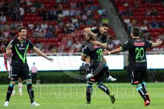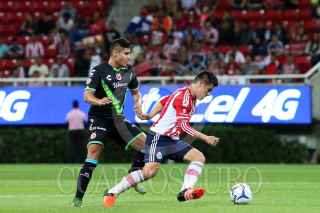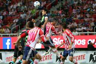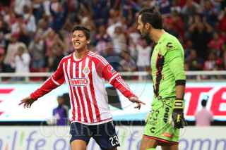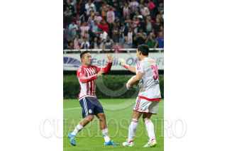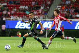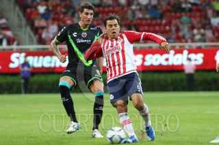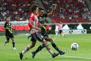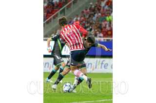 ZAPOPAN, JALISCO. 20OCTUBRE2015.- El jugador de Chivas, Carlos Fierro, disputa un balón frente al contrario de Veracruz, Emmanuel García, esto en partido correspondiente a los cuartos de final del Torneo Apertura 2015 de la Copa MX, en donde se enfrentaron los equipos de las Chivas de Guadalajara frente a los Tiburones Rojos del Veracruz, en partido que se llevo a cabo en el Estadio Omnilife, en donde el equipo local logra el pase a semifinales por la vía de los penales. FOTO: FERNANDO CARRANZA GARCIA/ CUARTOSCURO.COM