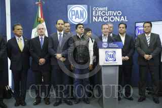 MÉXICO, D.F., 21OCTUBRE2015.- Ricardo Anaya, dirigente nacional del PAN, acompañado de Jorge Luis Preciado, ex candidato panista a la gubernatura de Colima, de los coordinadores en el Congreso de la Unión, Marko Cortés y Fernando Herrera, además de Santiago Creel y Miguel Ángel Yunes, ofreció una conferencia de prensa en la cual señalo que presentaron una prueba ante el Tribunal Electoral del Poder Judicial de la Federación de la intervención del gobierno de Colima en las pasadas elecciones, y con la cual se debe desechar el dictamen que da el triunfo al PRI y se debe anular la elección. FOTO: CUARTOSCURO.COM