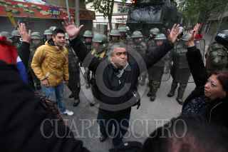 SANTIAGO, CHILE, 21OCTUBRE2015.- Una resolución judicial ordenó un fallo a favor de la empresa Wal-Mart para desalojar a más de 200 pequeños comerciantes de un predio propiedad de la transnacional, la cual pretende construir un supermercado en la zona donde se instalaban vendedores de muebles de manera legal. Carabineros de Chile arribó ésta madrugada y efectuó el desalojo de manera tajante y sin diálogo, dejando en la calle a los trabajadores y sus familias. En América Latina, Wal-Mart, ha enfrentado diversas críticas por daños ambientales, abusos laborales y corrupción. En México habría destinado al menos 24 millones de dólares para sobornar a funcionarios del país a fin de crecer su dominio del mercado. FOTO: FÉLIX MÁRQUEZ /CUARTOSCURO.COM