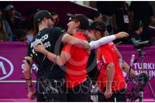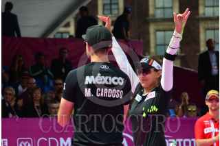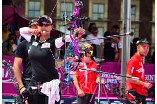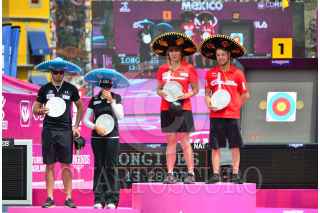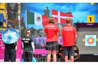 MÉXICO, D.F., 24OCTUBRE2015.- Mario Cardoso y Linda Ochoa, campeona mundial de Tiro con Arco, quedaron en segundo lugar en el Tiro Combinado de Parejas en contra de Dinamarca, quienes ocuparon la primera posición. El torneo internacional transcurre en estos momentos en el Zócalo capitalino. FOTO: MARÍA JOSÉ MARTÍNEZ /CUARTOSCURO.COM