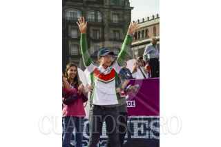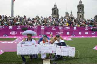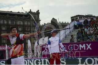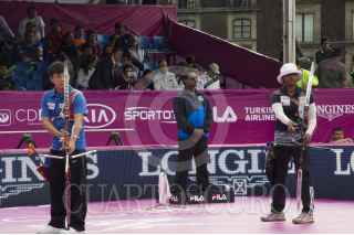 MÉXICO, D.F., 25OCTUBRE2015.- El Zócalo capitalino albergo la final de la Copa Mundial de Tiro con Arco coordinada por el Instituto Nacional del Deporte (Indeporte) y la CDMX. La presea de oro se la llevo el español Miguel Alvariño Garcia derrotando al francés Jean-Charles Valladont, el tercer lugar lo obtuvo el coreano Kim Woojin. Los reconocimientos fueron entregados por Horacio Vega, director General del Indeporte y Miguel Ángel Mancera, jefe de gobierno del Distrito Federal. En la imagen Kim Woojin, Miguel Alvariño Garcia y Jean-Charles Valladont. FOTO: GALO CAÑAS /CUARTOSCURO.COM