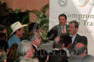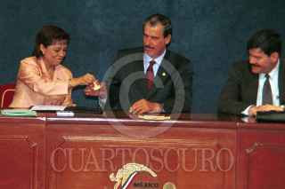 El presidente Vicente Fox al termino de el evento denominado "Compromiso Social por la Transparencia", así como la firma de un acuerdo de integridad en relación proveedor - gobierno, realizado en el Salón Adolfo López Mateos de la residencia oficial de Los Pinos. FOTO: David Bolaños/CUARTOSCURO.COM