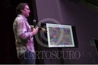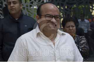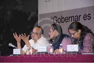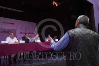 MÉXICO, D.F., 25OCTUBRE2015.- Juan Francisco Gutiérrez, presidente del Comisario general del ejido de Peñon de los Baños les comenta a el diputado federal Rafael Hernández Soriano; Israel Moreno Rivera, jefe delegacional de Venustiano Carranza; Salómon Chertorivski Woldenberg, secretario de Desarrollo Económico del Distrito Federal y a la diputada federal Evelyn Parra acerca de la participación ciudadana y algunas problemáticas que se están experimentando debido a la expropiación de terrenos para la construcción del nuevo Aeropuerto de la Ciudad de México. FOTO: GALO CAÑAS /CUARTOSCURO.COM