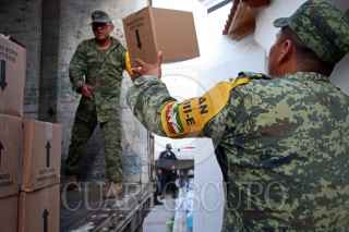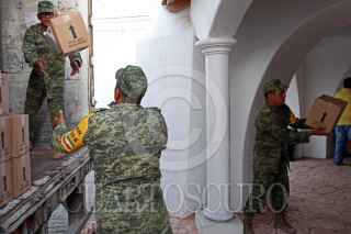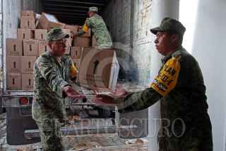 CIHUATLÁN, JALISCO. 25OCTUBRE15.-. En el poblado de el aguacate, municipio de Cihuatlán, Militares asignados al Plan DN-III, bajan víveres de los trailers que llegaron con el apoyo para los damnificados que fueron afectados por el Huracán Patricia que azoto la Costa alegre del estado. FOTO: FERNANDO CARRANZA GARCIA / CUARTOSCURO.COM