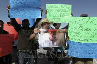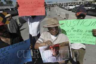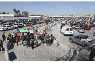 TIJUANA, BAJA CALIFORNIA, 26OCTUBRE2015.- Poco más de 30 integrantes de distintas asociaciones pro migrantes se manifestaron de forma pacífica en la garita de San Ysido, para exigir se investigue a fondo y se castigue al agente fronterizo que disparó y mató al migrante Miguel Ángel Marín, el pasado miércoles, en la garita entre Mexicali y Calexico. La manifestación se realizó simultáneamente en la garita de la capital del estado, a muy pocos metros de donde sucedió el hecho, al lugar acudieron 50 integrantes de la asociación “Ángeles sin Fronteras". FOTO: CHRISTIAN SERNA /CUARTOSCURO.COM