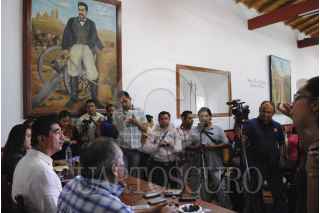 TIXTLA, GURRERO, 26OCTUBRE2015.- El presidente del Consejo municipal Raúl Vega Astudillo, acompañado de la regidora María Natividad Vargas Dircio, María de Jesús Zamudio y del regidor Cesáreo Muñoz Vázquez, dieron una conferencia de prensa a medios de comunicación en la que anunciaron que la administración le fue hereda sin dineros con déficit de 84 millones y 36 millones de laudos laborales, en seguridad no hay elementos de la policía municipal para garantizar la seguridad en el municipio y ha hecho un llamado al ejército, a la policía federal para que lo apoyen en la tarea de seguridad y han exhortado a la ciudadanía para que no salga a la calles a partir de la nueve de la noche “Es un toque de queda ciudadano” asentó Vega Astudillo. FOTO: JOSÉ I. HERNÁNDEZ / CUARTOSCURO.COM