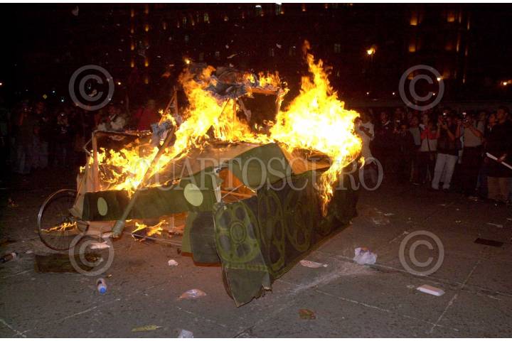 Un tanque hecho de cartón por estudiantes de la UNAM, sirvió como recuerdo de las tanquetas que en 1968, tomaran la Plaza de la Constitución; solo que esta vez el resultado fue otro. FOTO: David Bolaños/CUARTOSCURO.COM