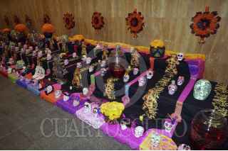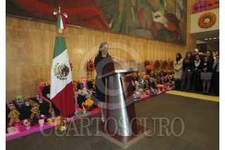 MÉXICO, D.F., 27OCTUBRE2015.- Con el objetivo de preservar nuestras tradiciones, la Secretaría de Relaciones Exteriores (SRE) instaló una ofrenda con motivo del Día de Muertos en el vestíbulo de su edificio central, elaborada por la artista Betsabeé Romero y dedicada “A la memoria de las migrantes desaparecidas”. Durante la inauguración, la Canciller Claudia Ruiz Massieu reconoció el papel de las mujeres migrantes, a quienes calificó de “nuevas heroínas”. FOTO: SRE /CUARTOSCURO.COM