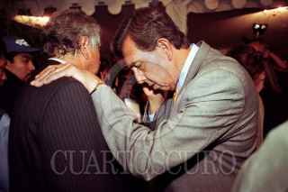 Cuauhtémoc Cárdenas aceptó su derrota electoral y se consuela en el hombro de Carlos Mandujano. FOTO: Inti Vargas/CUARTOSCURO.COM