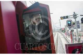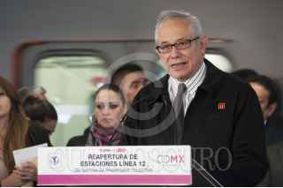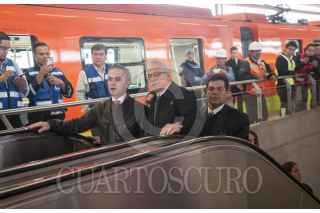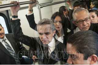 MÉXICO, D.F., 28OCTUBRE2015.- Miguel Ángel Mancera, jefe de gobierno capitalino; director del STC Metro, Jorge Gaviño; Edgar Tungüi, secretario de Obras del Distrito Federal y Dione Anguiano, delegada de Iztapalapa, realizaron un recorrido en un convoy del metro de la estación Periférico Oriente hacia Culhuacán para poner en operación dicho tramo de 5 estaciones de la línea dorada, el cual fue reabierto al público de forma gratuita, camiones del servicio RTP seguirán brindando servicio gratuito de Periférico hacia Tláhuac. FOTO: DIEGO SIMÓN SÁNCHEZ /CUARTOSCURO.COM