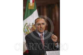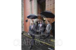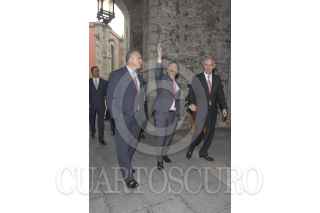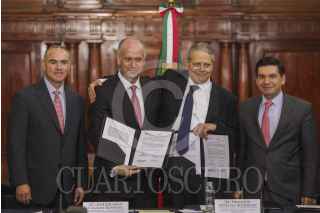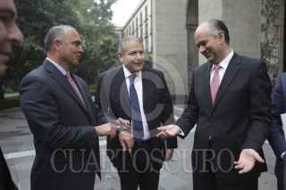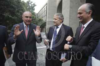 MÉXICO, D.F., 28OCTUBRE2015.- José Calzada Rovirosa, titular de la Sagarpa; Fernando Aportela, subsecretario de Hacienda y Crédito Público; y Juan Carlos Cortés García, director Financiera Nacional de Desarrollo Agropecuario Rural, Forestal y Pesquero; al finalizar la ceremonia en donde firmaron un convenio de colaboración, en el Palacio Nacional. FOTO: ANDRÉS YAÑEZ /CUARTOSCURO.COM