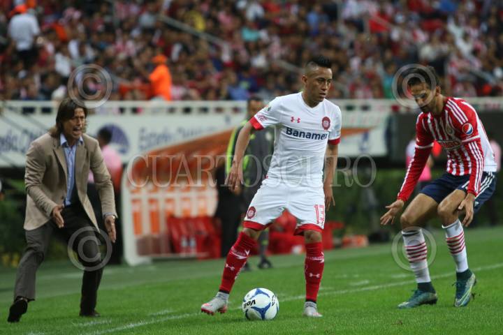 ZAPOPAN, JALISCO.- 28OCTUBRE2015.- El jugador de Chivas, Oswaldo Alanis, disputa un balón frente al contrario de Toluca, Fernando Uribe, esto en partido correspondiente a la semifinal del Torneo Apertura 2015 de la Copa MX, en donde se enfrentan los equipos de las Chivas de Guadalajara frente a los Diablos Rojos del Toluca y en donde el marcador final fue de 1-0, que pone a Chivas en la Final de la Copa MX, en partido que se llevo a cabo en el Estadio Omnilife. FOTO: FERNANDO CARRANZA GARCIA/ CUARTOSCURO.COM