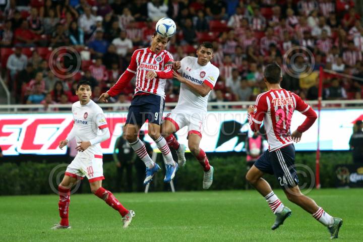 ZAPOPAN, JALISCO.- 28OCTUBRE2015.- El jugador de Chivas, Oswaldo Alanis, disputa un balón frente al contrario de Toluca, Fernando Uribe, esto en partido correspondiente a la semifinal del Torneo Apertura 2015 de la Copa MX, en donde se enfrentan los equipos de las Chivas de Guadalajara frente a los Diablos Rojos del Toluca y en donde el marcador final fue de 1-0, que pone a Chivas en la Final de la Copa MX, en partido que se llevo a cabo en el Estadio Omnilife. FOTO: FERNANDO CARRANZA GARCIA/ CUARTOSCURO.COM