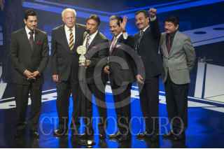 MÉXICO, D.F., 28OCTUBRE2015.- José Narro Robles, rector de la UNAM, entregó al grupo Los Tigres del Norte una presea por trayectoria artística en el marco de la decimo cuarta entrega de las Lunas del Auditorio. FOTO: DIEGO SIMÓN SÁNCHEZ /CUARTOSCURO.COM