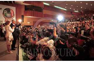 Francisco Labastida Ochoa y Maria Teresa Uriarte a su llegada del auditorio del PRI, donde fueron avacionados por decenas de priistas. FOTO: German Romero/CUARTOSCURO.COM
