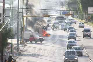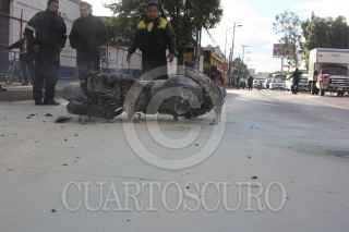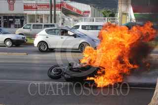 ECATEPEC, ESTADO DE MÉXICO, 31OCTUBRE2015.- El conductor de una motocicleta se derrapo sobre el asfalto, cuando freno repentinamente su moto para no atropellar a un perro que cruzó la avenida López Portillo en la Colonia Guadalupe Victoria de este Municipio. Al derramar la gasolina, la motocicleta comenzó arder en llamas, siendo sofocadas por Elementos de la Comisión Estatal de Seguridad Ciudadana (CESC). FOTO: DIEGO REYES /CUARTOSCURO.COM