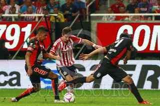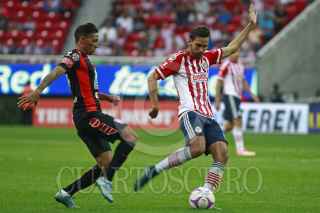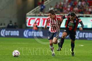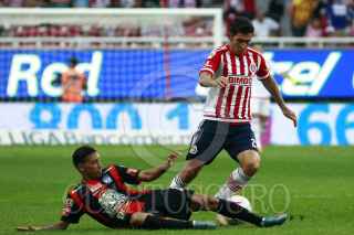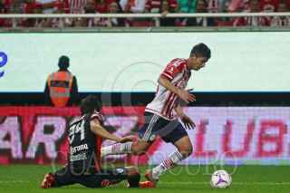 ZAPOPAN, JALISCO. 01NOVIEMBRE2015.- El jugador del Chivas Carlos Fierro, disputa un balón frente al contrario del Pachuca, Rubén Botta, esto en partido correspondiente a la Jornada 15 del Torneo Apertura 2015 de la Liga MX, en donde se enfrentaron los equipos de las Chivas de Guadalajara frente a Tuzos del Pachuca, en partido que se llevo a cabo en el Estadio Omnilife y en donde el marcador final fue de 4-4. FOTO: FERNANDO CARRANZA GARCIA / CUARTOSCURO.COM