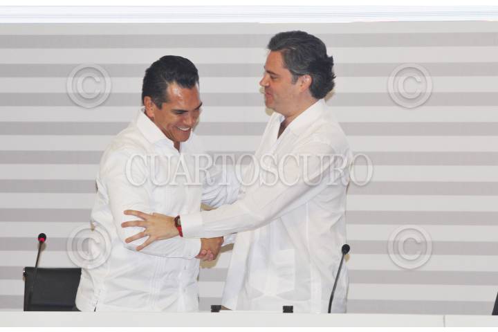 CAMPECHE, CAMPECHE, 04NOVIEMBRE2015.- Rolando Zapata, gobernador de Yucatán; Gabino Cué Monteagudo, gobernador de Oaxaca, Aurelio Nuño, titular de la SEP, y Alejandro Moreno Cárdenas, gobernador de la entidad, durante la inauguración de los trabajos del Mecanismo de Coordinación Regional Zona Sur-Sureste. FOTO: SEP /CUARTOSCURO.COM