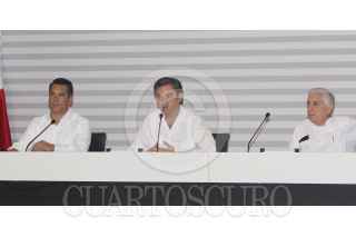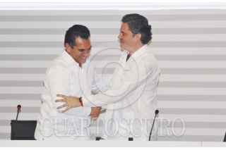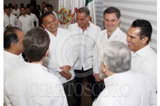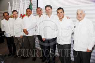 CAMPECHE, CAMPECHE, 04NOVIEMBRE2015.- Rolando Zapata, gobernador de Yucatán; Gabino Cué Monteagudo, gobernador de Oaxaca, Aurelio Nuño, titular de la SEP, y Alejandro Moreno Cárdenas, gobernador de la entidad, durante la inauguración de los trabajos del Mecanismo de Coordinación Regional Zona Sur-Sureste. FOTO: SEP /CUARTOSCURO.COM