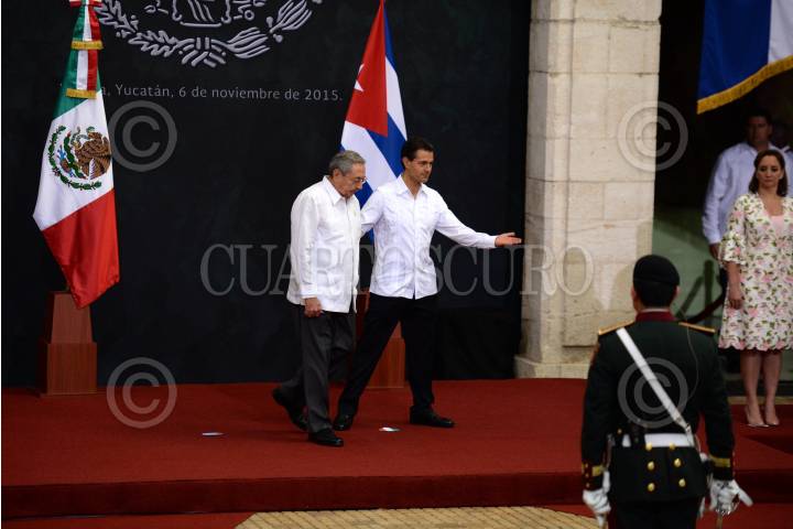 MÉRIDA, YUCATÁN, 06NOVIEMBRE2015.- Raúl Castro, presidente de Cuba y Enrique Peña Nieto, presidente de México durante la ceremonia oficial durante la visita de Estado del presidente caribeño. FOTO: ADOLFO VLADIMIR /CUARTOSCURO.COM