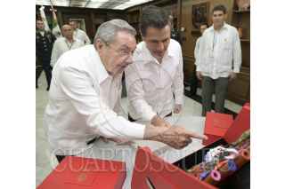 MÉRIDA YUCATÁN, 06NOVIEMBRE2015.- El Presidente Enrique Peña Nieto y el Presidente de los Consejos de Estado y de Ministros de la República de Cuba, Raúl Castro Ruz, intercambiaron obsequios en el Despacho del Gobernador, en el Palacio de Gobierno del Estado de Yucatán. FOTO: PRESIDENCIA /CUARTOSCURO.COM
