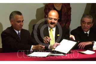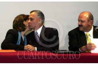El Procurador Genral de la República Rafael Macedo de la Concha es felicitado por Sari Bermudes, directora del Consejo Nacional de Cultura y las Artes, al termino de la firma de convenio entre la SEP Y LA PGR, en el Palacio de Bellas Artes. FOTO: David Bolaños/CUARTOSCURO.COM