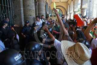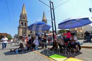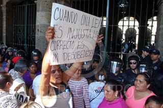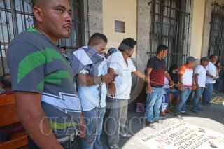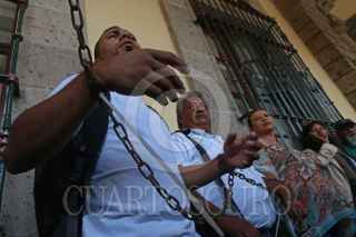 GUADALAJARA, JALISCO. 09NOVIEMBRE2015.-Comerciantes Ambulantes de Guadalajara se manifestaron a las afueras de la presidencia municipal, esto por que se oponen a retirarse de la calles del centro histórico de la ciudad, el día de mañana a partir de las 8 am, habrá antimotines y personal de todas las áreas del ayuntamiento para vigilar que los vendedores se instalen, también algunos comerciantes del baratillo mostraron su inconformidad y se encadenaron a las afueras del inmueble. FOTO: FERNANDO CARRANZA GARCIA / CUARTOSCURO.COM